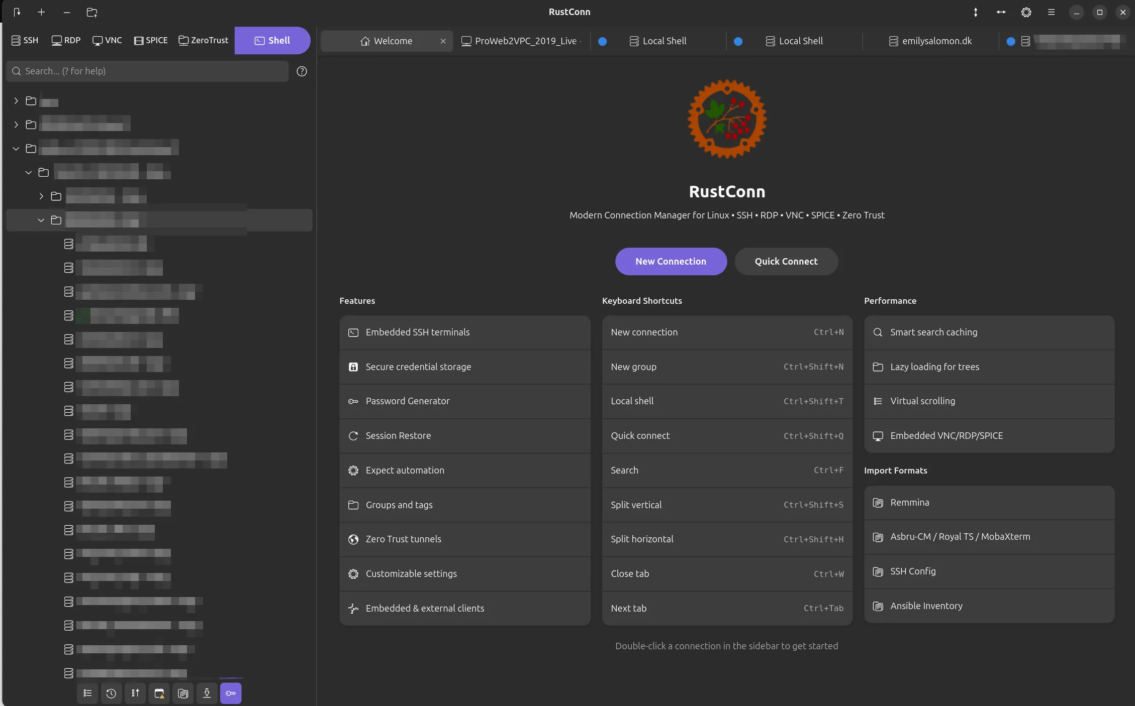 I’d like to introduce RustConn, a modern connection manager for Linux with a GTK4/Wayland-native interface. Manage SSH, RDP, VNC, SPICE, Telnet, and Zero Trust connections from a single application. All core protocols use embedded Rust implementations — no external dependencies required. Supports import from Remmina, Asbru-CM, SSH config, Ansible, Royal TS, and MobaXterm. Credentials are stored securely via KeePassXC, GNOME Keyring, Bitwarden CLI, or 1Password CLI. Available on Flathub, Snap, AppImage, and OBS (deb/rpm).